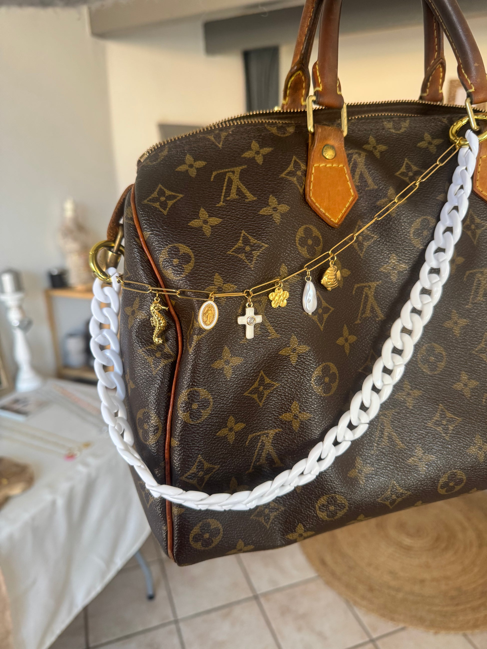 Vous pourrez l’attacher grâce a ses petits clips qui sont en métal accompagné de sa chaîne et de ses charms en acier inoxydable et de sa chaîne colorée en plastique ⭐️