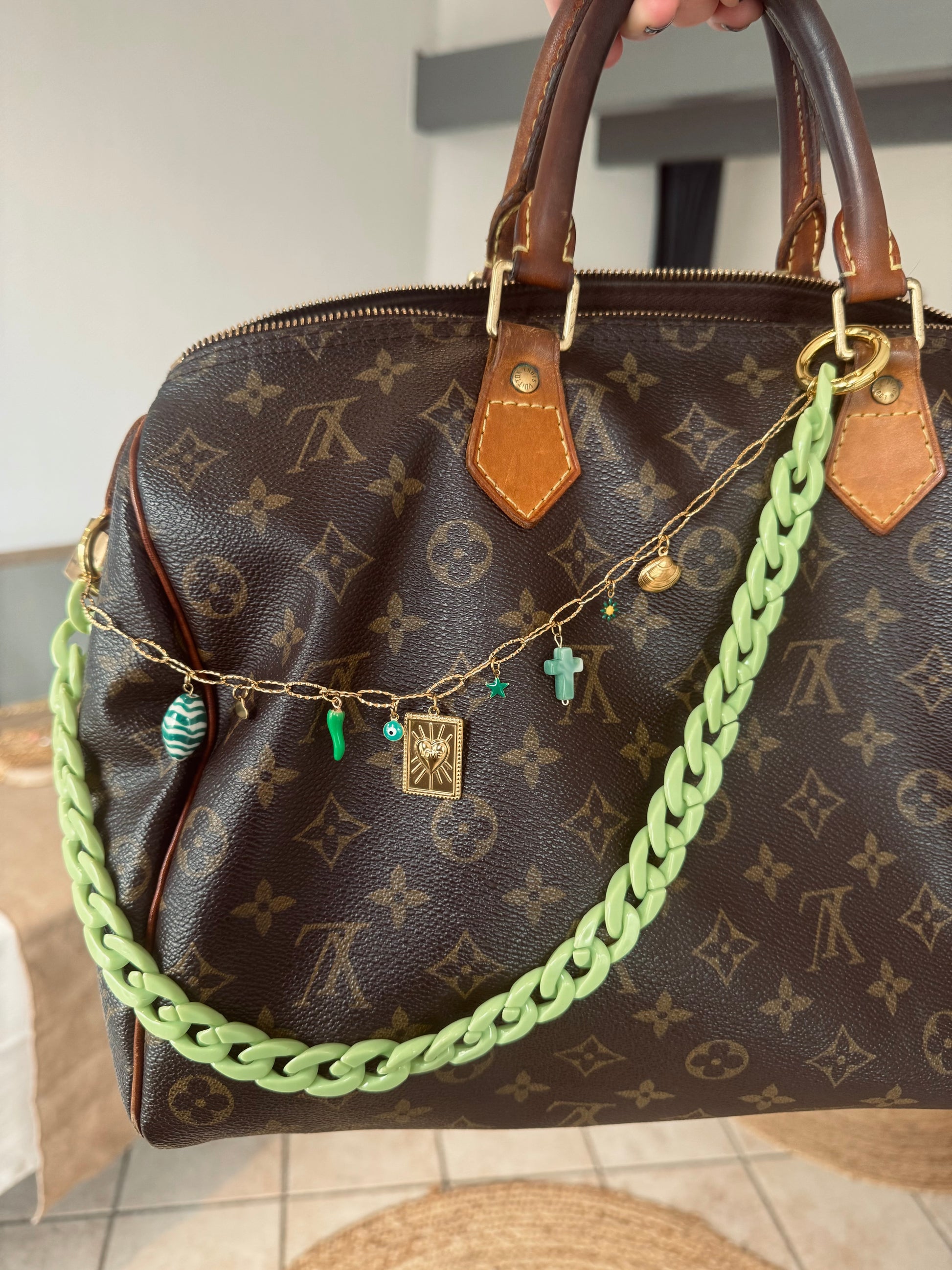 Vous pourrez l’attacher grâce a ses petits clips qui sont en métal accompagné de sa chaîne et de ses charms en acier inoxydable et de sa chaîne colorée en plastique ⭐️