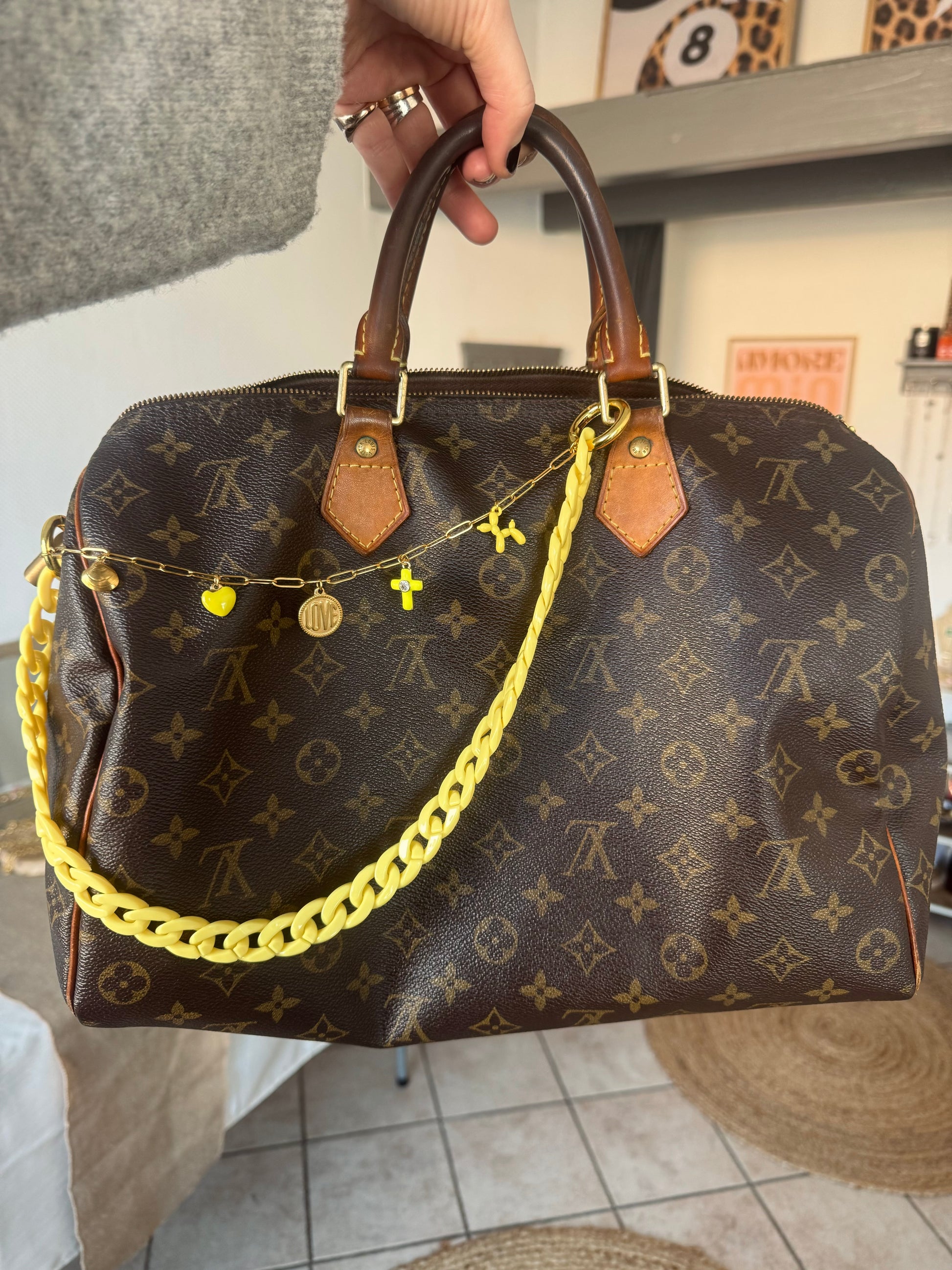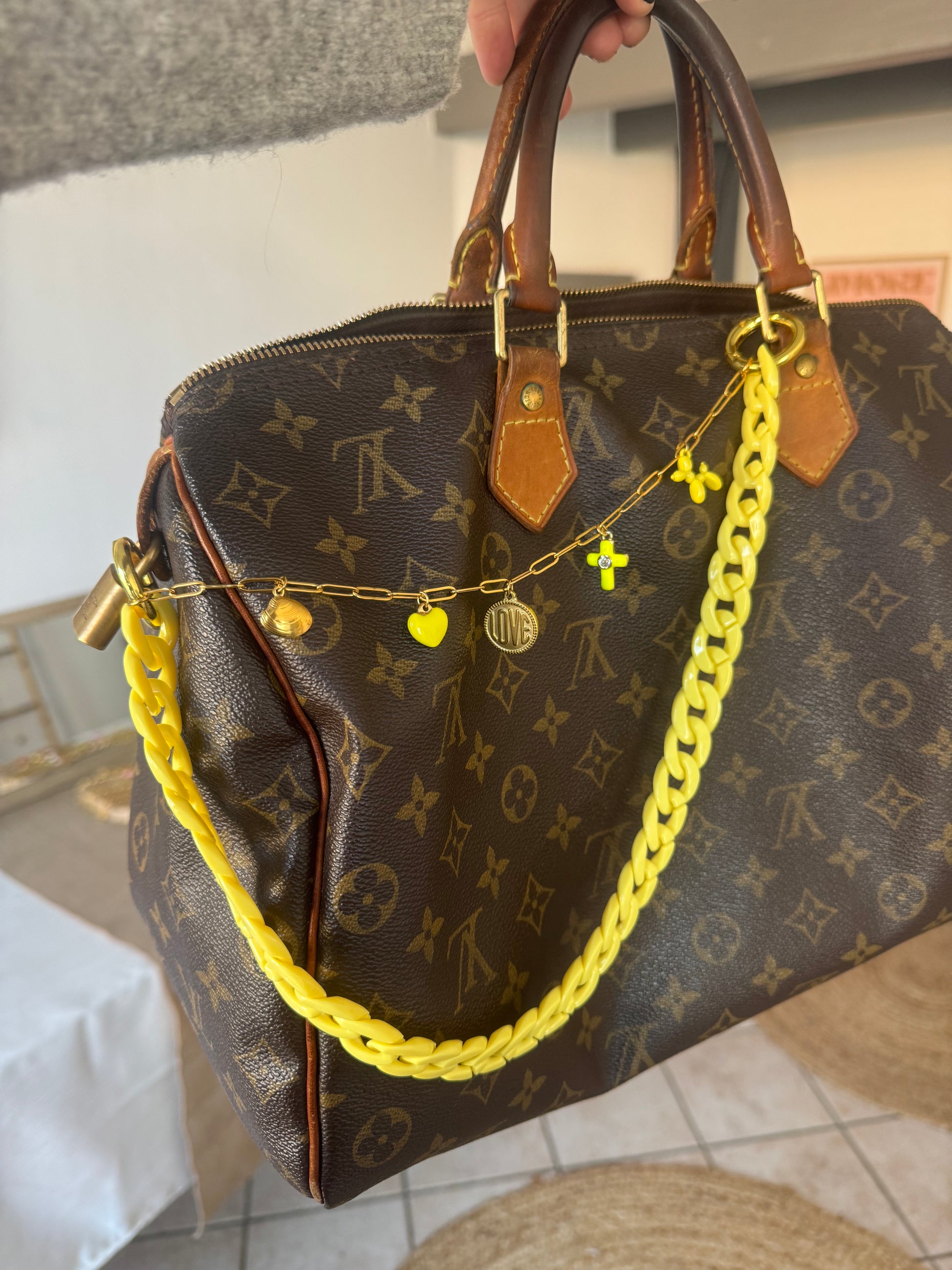 Vous pourrez l’attacher grâce a ses petits clips qui sont en métal accompagné de sa chaîne et de ses charms en acier inoxydable et de sa chaîne colorée en plastique ⭐️